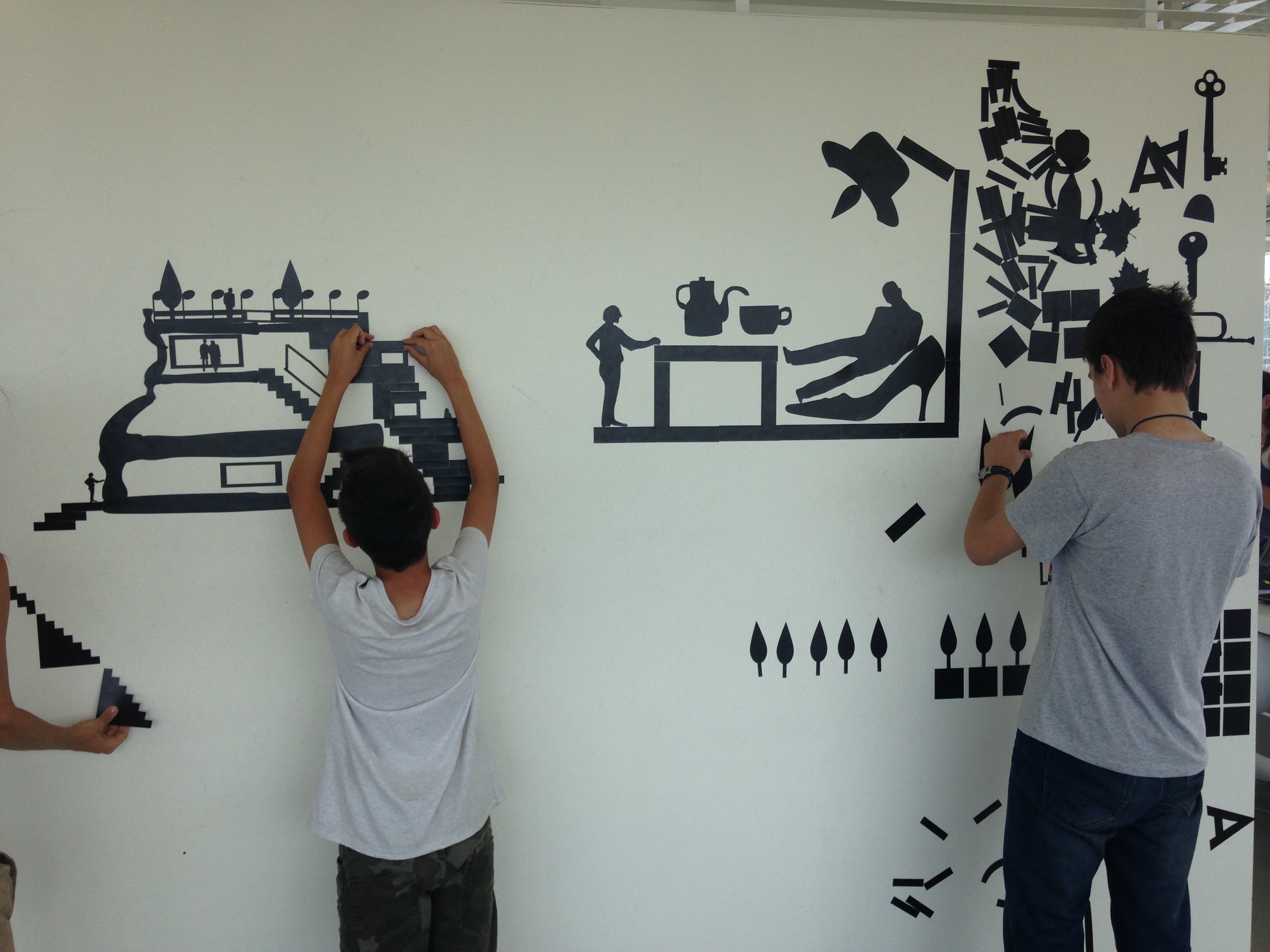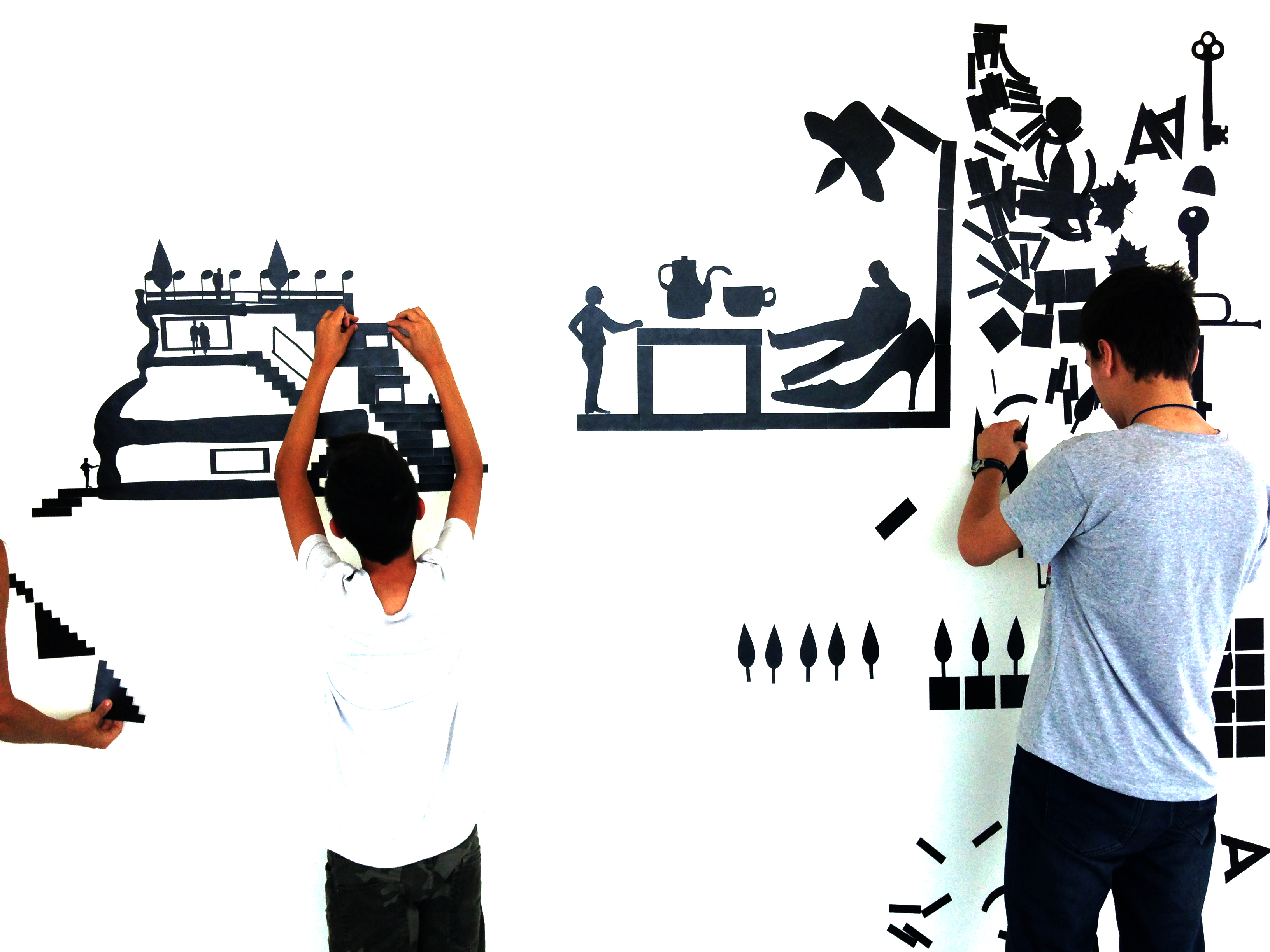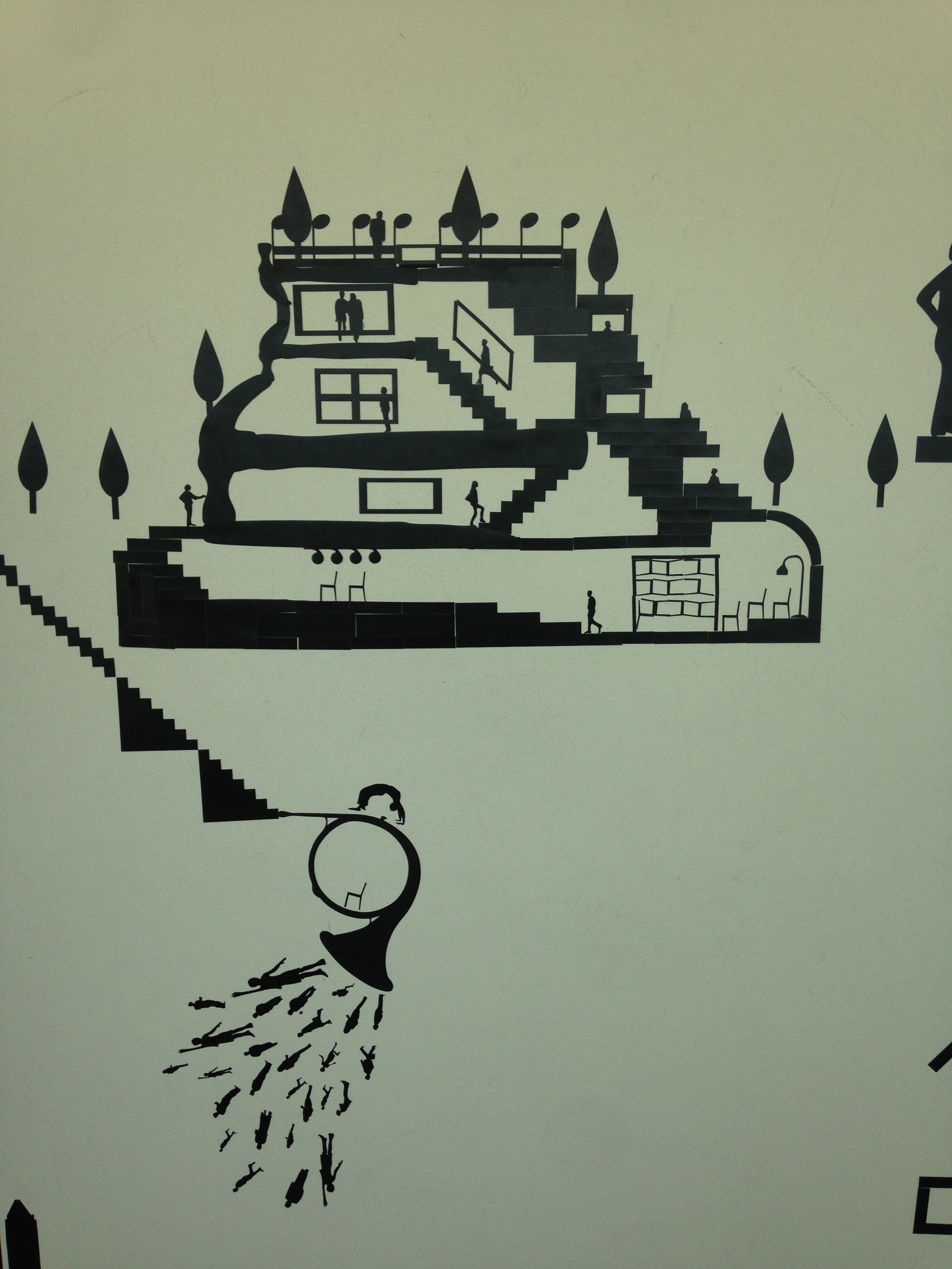 Στο Κέντρο Επισκεπτών του Κέντρου Πολιτισμού Ιδρυμα Σταύρος Νιάρχος αλλάξαμε τα μεγέθη και τις κλίμακες και δημιουργήσαμε με φαντασία παράξενα κτίρια. Κύριοι με γραβάτες έγιναν στέγες, σφυριά μεταμορφώθηκαν σε πατώματα, και μερικές νότες έφτιαξαν ένα ωραίο μπαλκόνι. Το παιχνίδι έγινε με μαγνήτες πάνω στον μαγνητικό τοίχο του Κέντρου Επισκεπτών στα πλαίσια των εκπαιδευτικών εκδηλώσεων που γίνονται κάθε μήνα στο ΚΕ