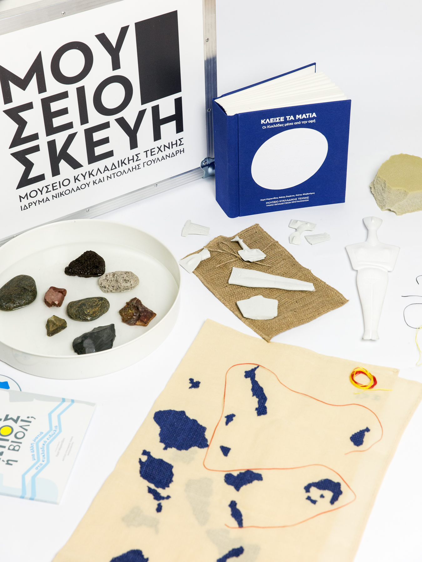 The kit contains a glossary book printed in typical and braille writing, an embroidered map of the Cyclades, a tactile water map, pebbles of different shapes and minerals, a puzzle consisting of broken parts of different figurines, pieces of foam and a replica of a marble figurine.